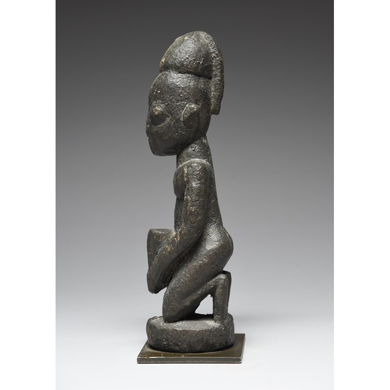 kneeling and holding a vessel and with a tailled coiffure and an encrusted patina,