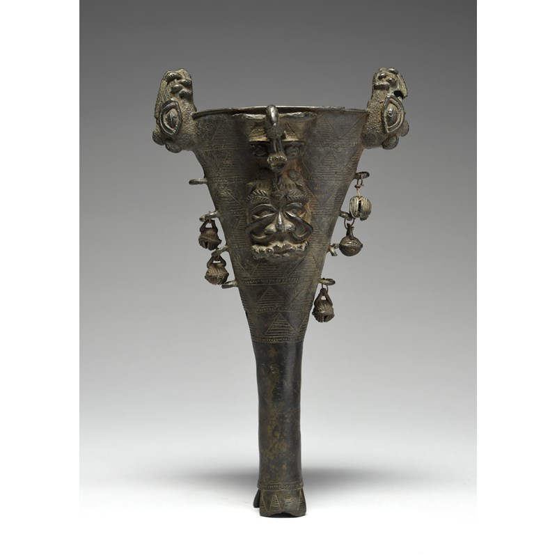 cast bronze of tapered form, with part incised linear and dot decoration, with a pair of leopards heads to the top ends and a central head with serpents and a bird crest, the sides with ring attachments and five applied bells, the flared terminal with cut sides and conforming incised decoration,