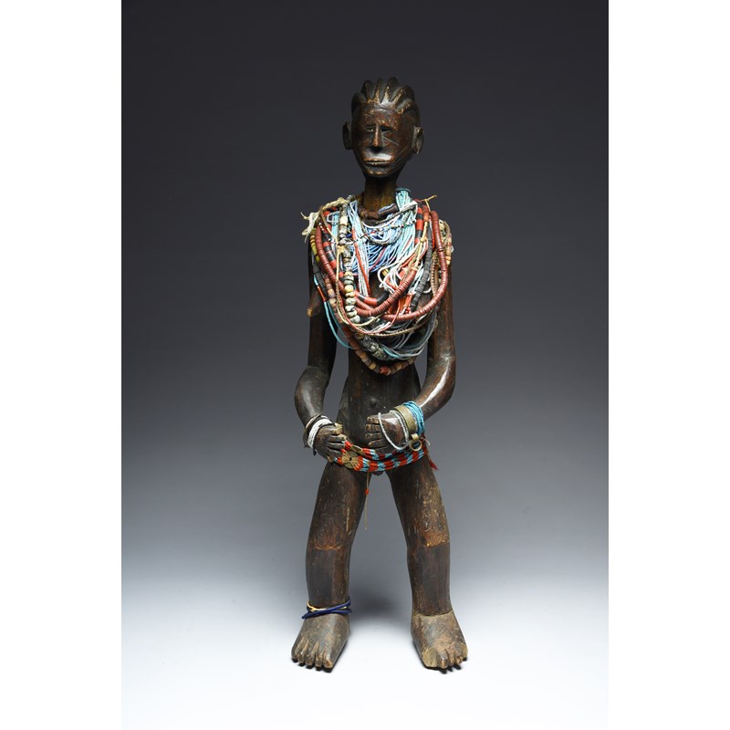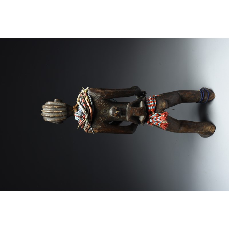 standing with a ribbed coiffure and facial and back scarifications, with an infant to her back, with her forearms and hands curved to her front, later adorned with beads,