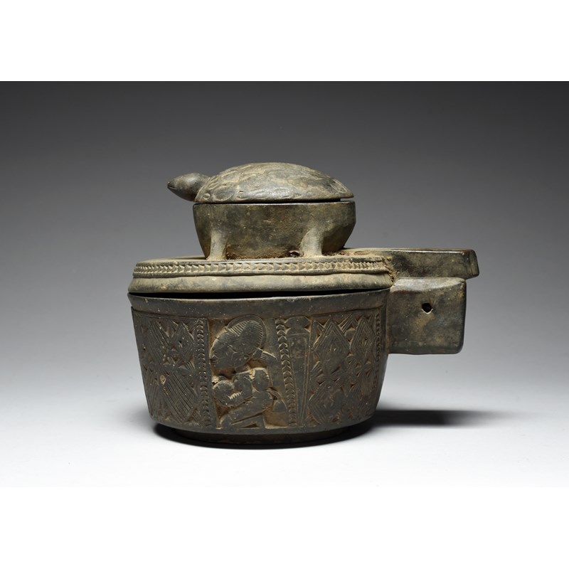 the sides carved in low relief a central standing figure, holding two staffs, and two kneeling offering figures, between geometric panels, the hinged flat cover with lidded model tortoise,