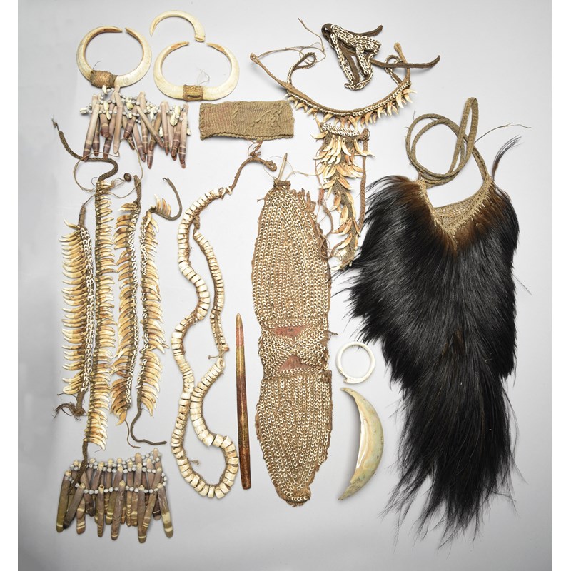 a Highlands tapa and shell ornament, 50cm long, a woven fibre bag, with applied cassowary feathers, 57cm long, two pairs of boars tusks, a single boars tusk, a shell bracelet, a woven fibre armband, a shell scoop/ornament, a fibre and shell body ornament, a shell disc necklace, 110cm long, two shell and seed necklaces and a cassowary bone lime spatula, with carved and pigment decoration, 27cm long, on a stand. (20)