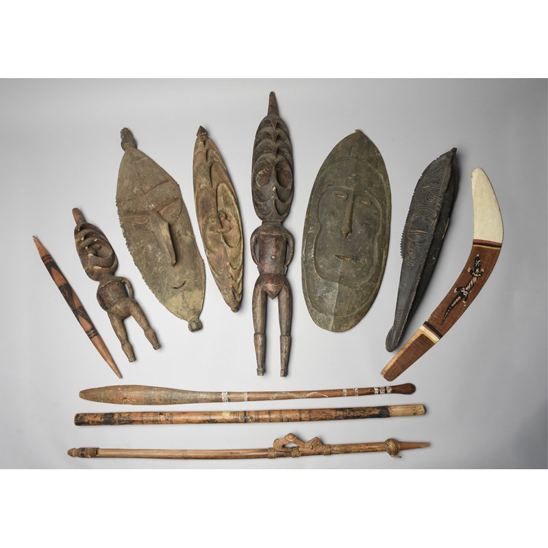 two Papua New Guinea ancestor figures, 43cm and 75cm high, a similar charm with a painted back, 50cm high, two Papua New Guinea masks, a spear thrower, a bamboo pipe, an Austrailian Aboriginal club, a boomerang and a digging stick. (11)