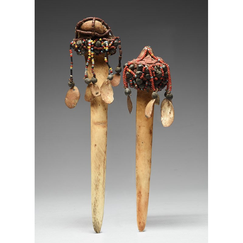 bone, cloth, shells, banana seeds and coloured glass beads,
