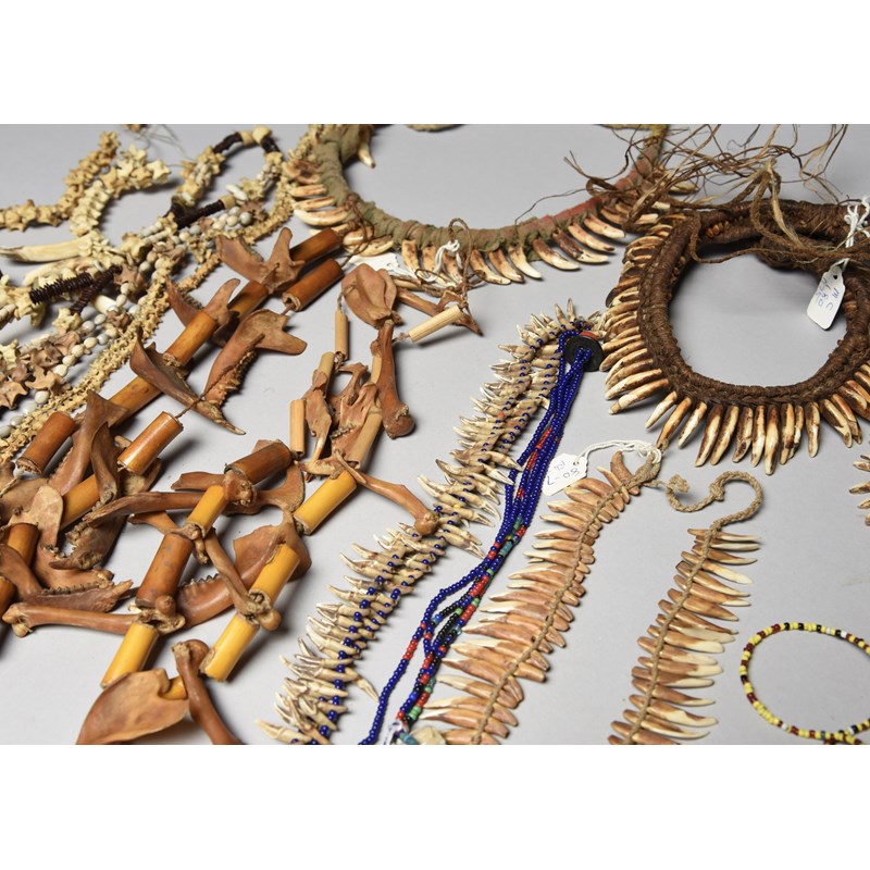 snake vertebrae, pig's teeth, tree kangaroo teeth, coloured glass beads, Job's tears seeds, shell, a button, dog's teeth, seeds, possum jaws, orchid stems, fibre and cloth. (14)
