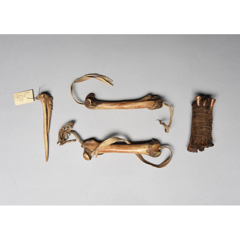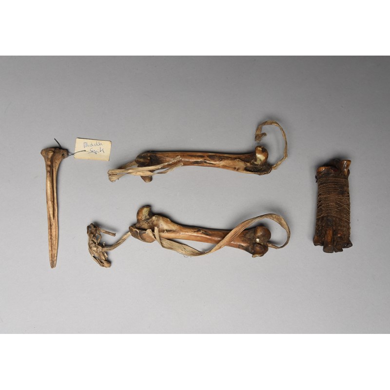 a Middle Sepik River bone amulet, 11.5cm long, and an Eastern Highlands bone and fibre belt. (4)