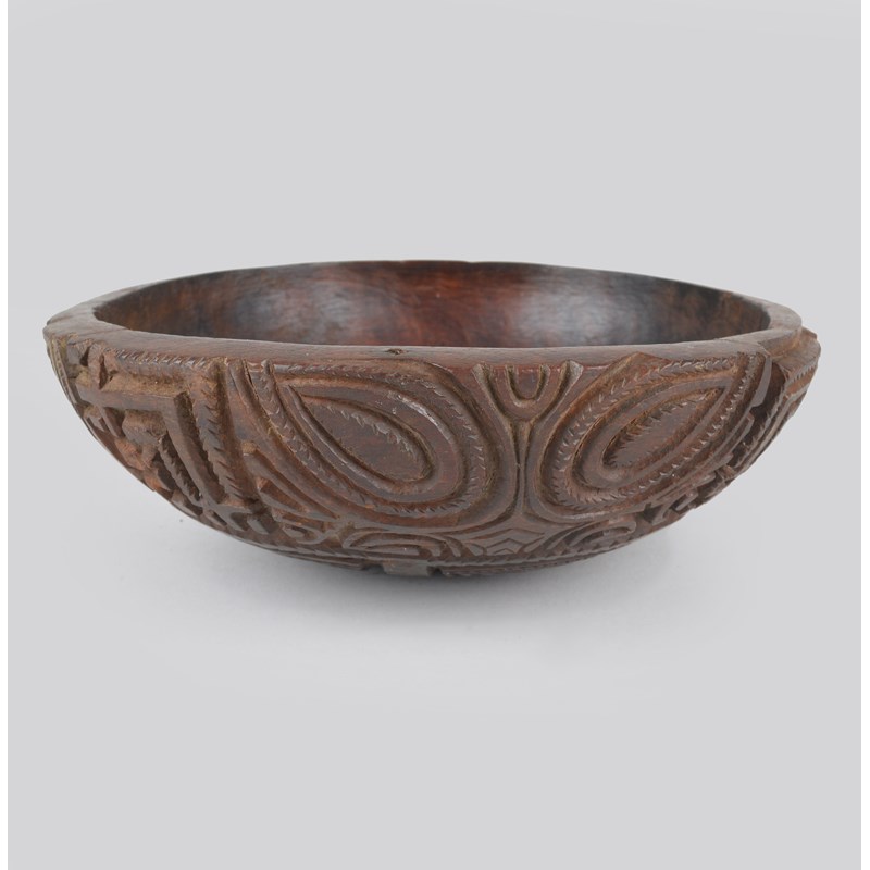 A Marquesas Islands bowl Polynesia the exterior with deep relief carved stylised eyes and...