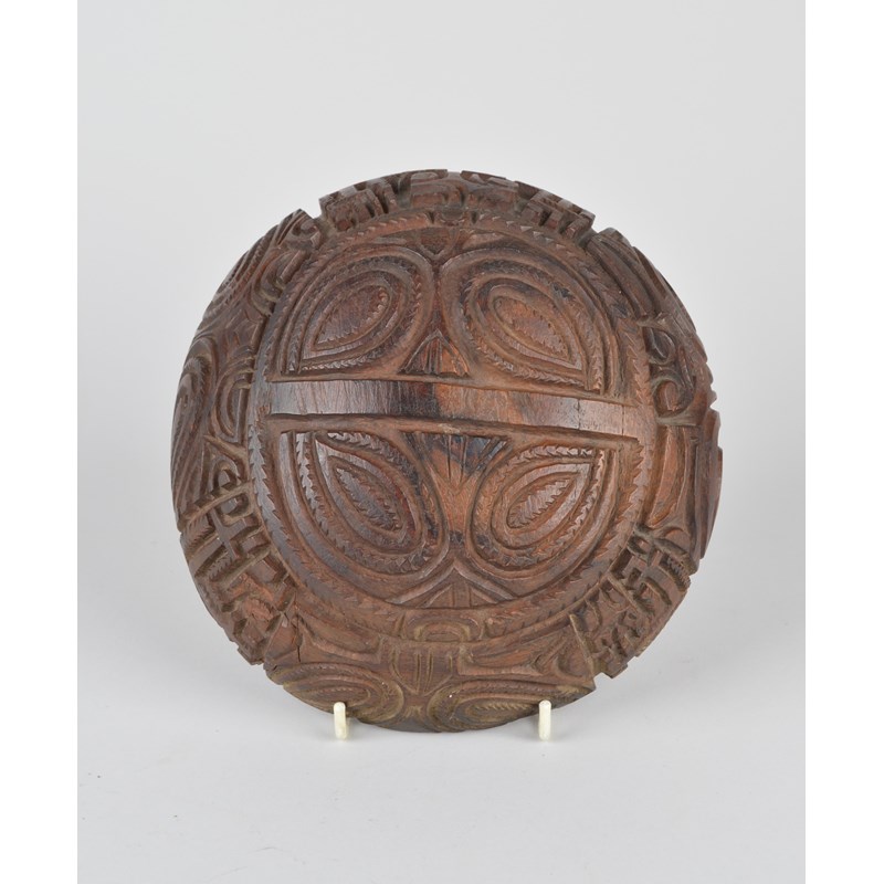 the exterior with deep relief carved stylised eyes and geometric symbols,