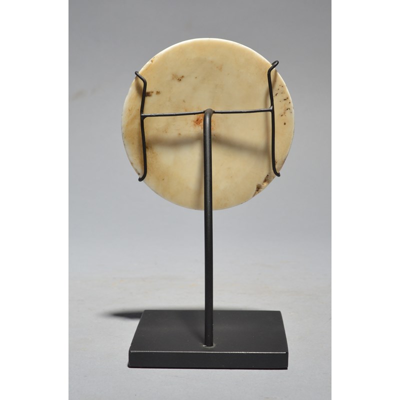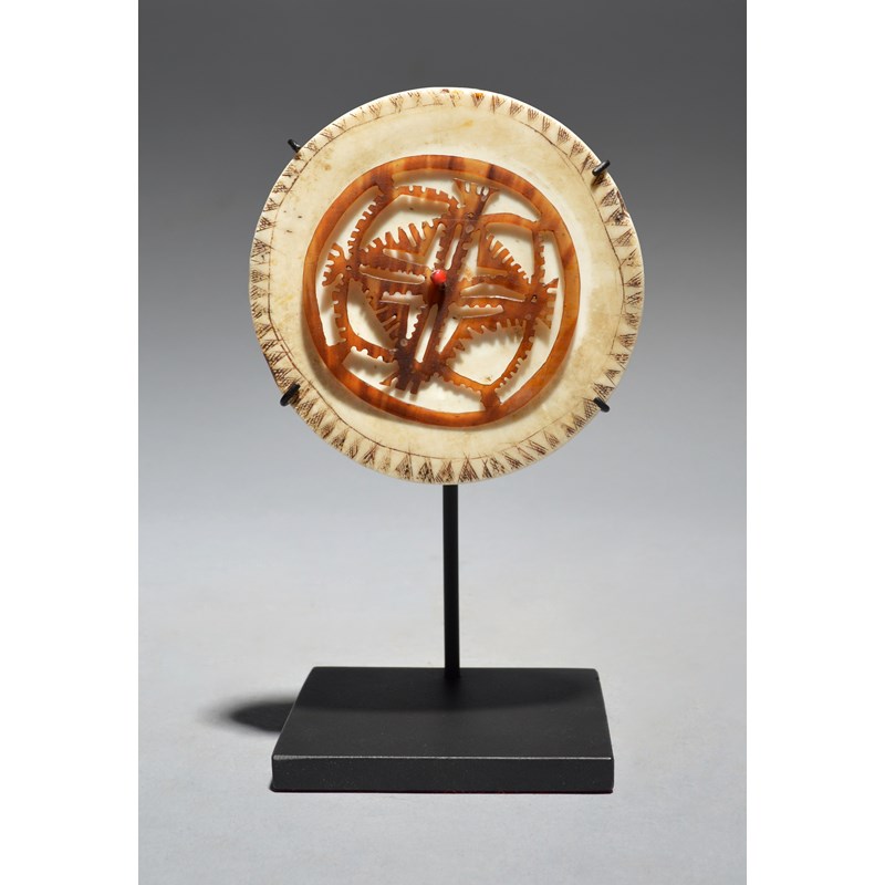 tridacna shell and turtleshell, the main disc with an incised chevron edge and a stylised bird pierced centre with a red and white glass bead,