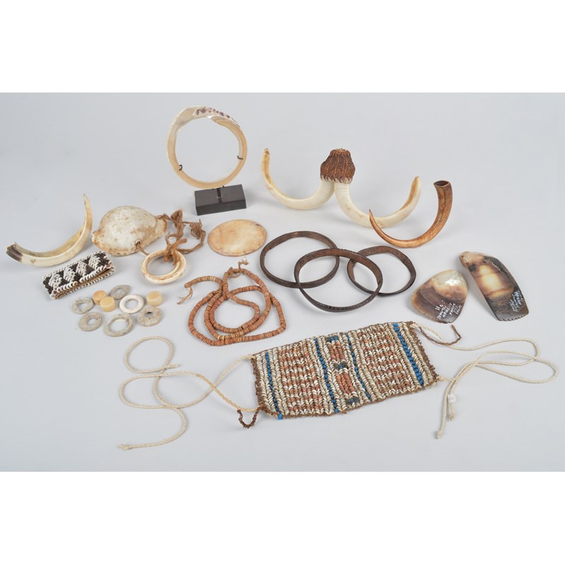 a cowrie shell with a two shell rings joined with a fibre cord, a disc shell necklace, a tusk nose ornament, six shell rings, three shell ear plugs, two Solomon Islands shell scrapers, inscribed, a Fiji shell anklet, faintly inscribed, on a stand, a Solomon Islands shell and fibre armband, a shell and coconut band, three coconut bracelets, a tusk ornament and a tusk. (23)