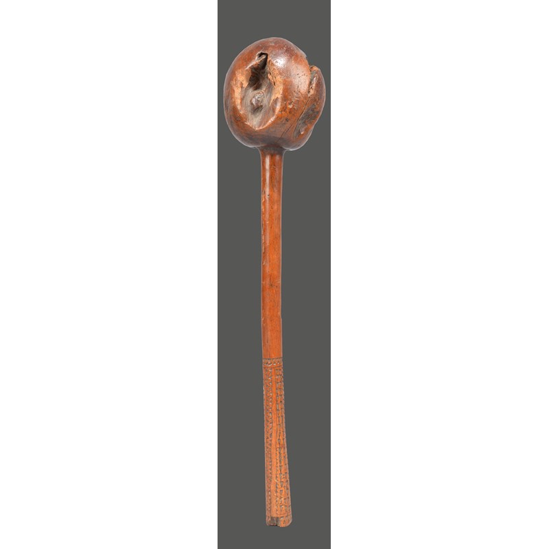 A Fiji throwing club i ula drisia Melanesia with an ovoid head and a carved zig-zag grip and a...