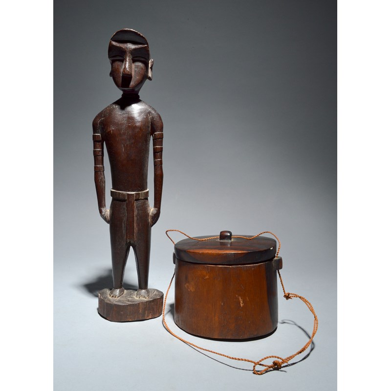 and a Tokelau Islands fish hook container and cover, 12.5cm high. (3)