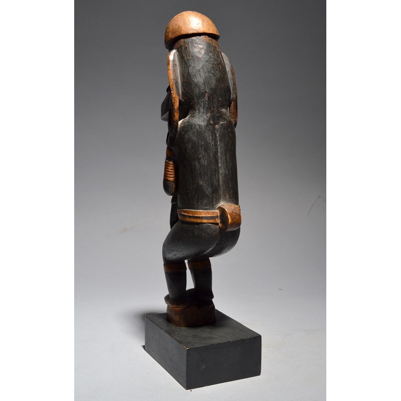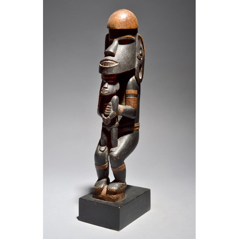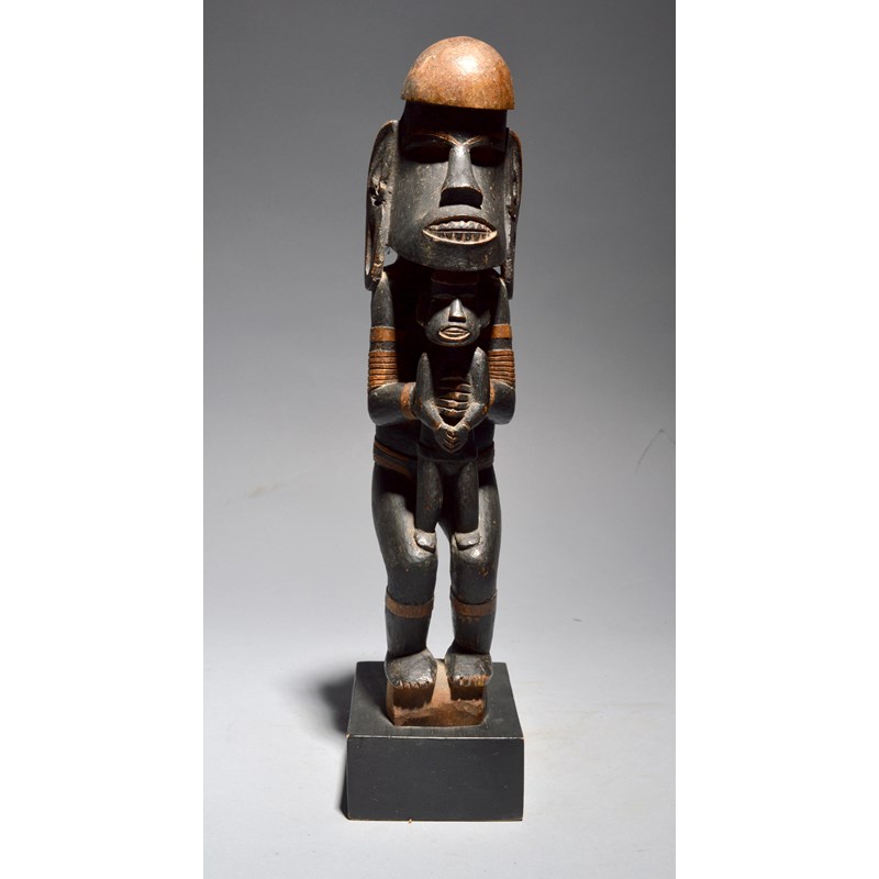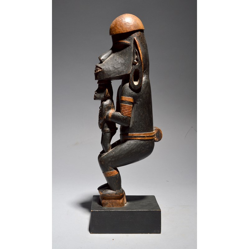 carved as a crouching guardian figure, with long earlobes, armbands and a belt with a knot back, clasping a figure whilst supported on his knees, with black staining,