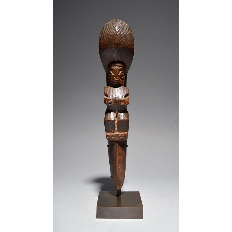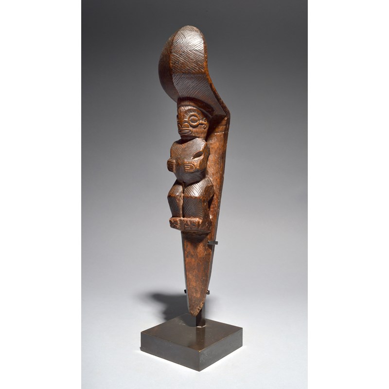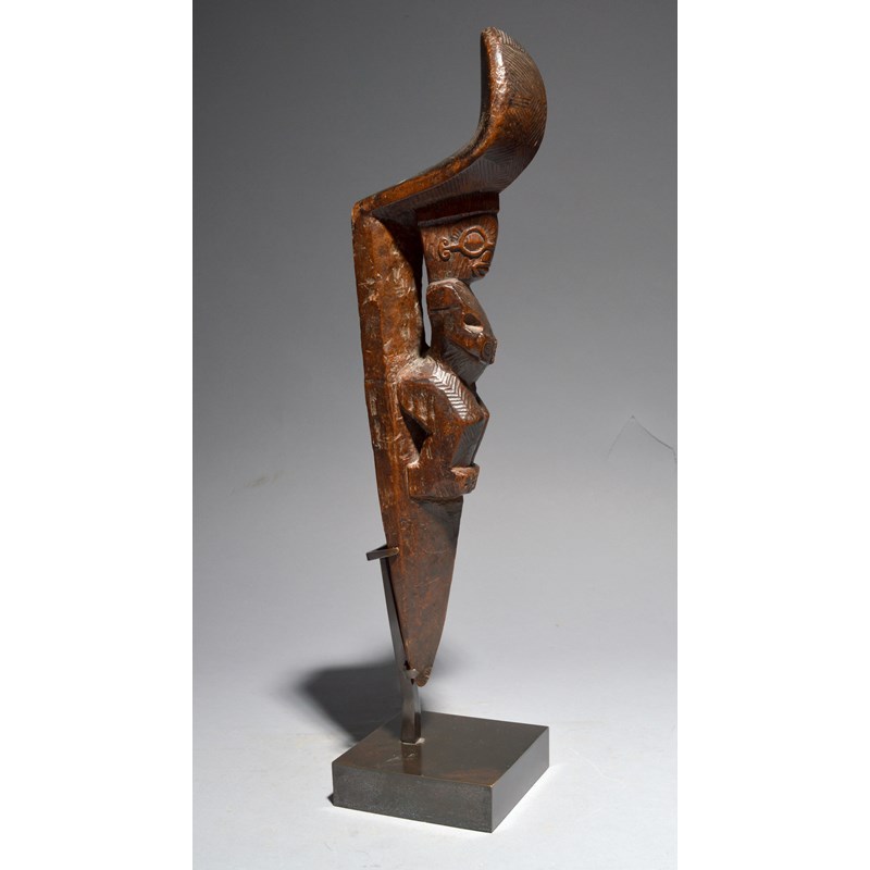 A Marquesas Islands stilt step Polynesia with a standing male figure with the hands placed on the...