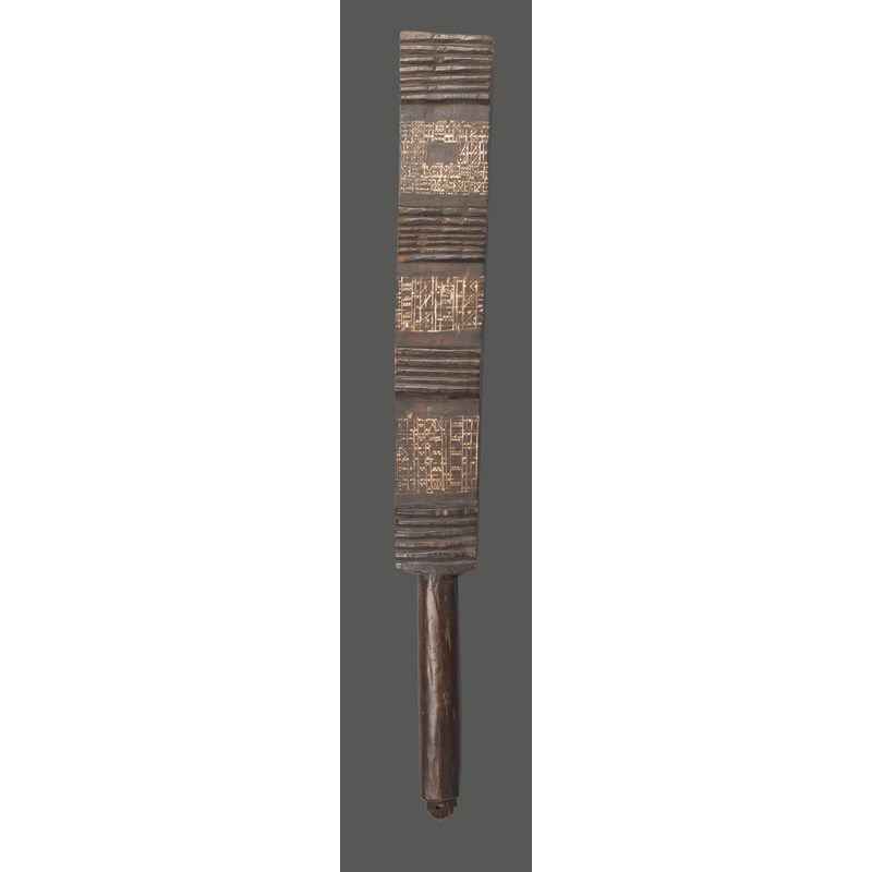 A Samoa club Polynesia the heavy blade with ribs and panels of carved and pigment filled...
