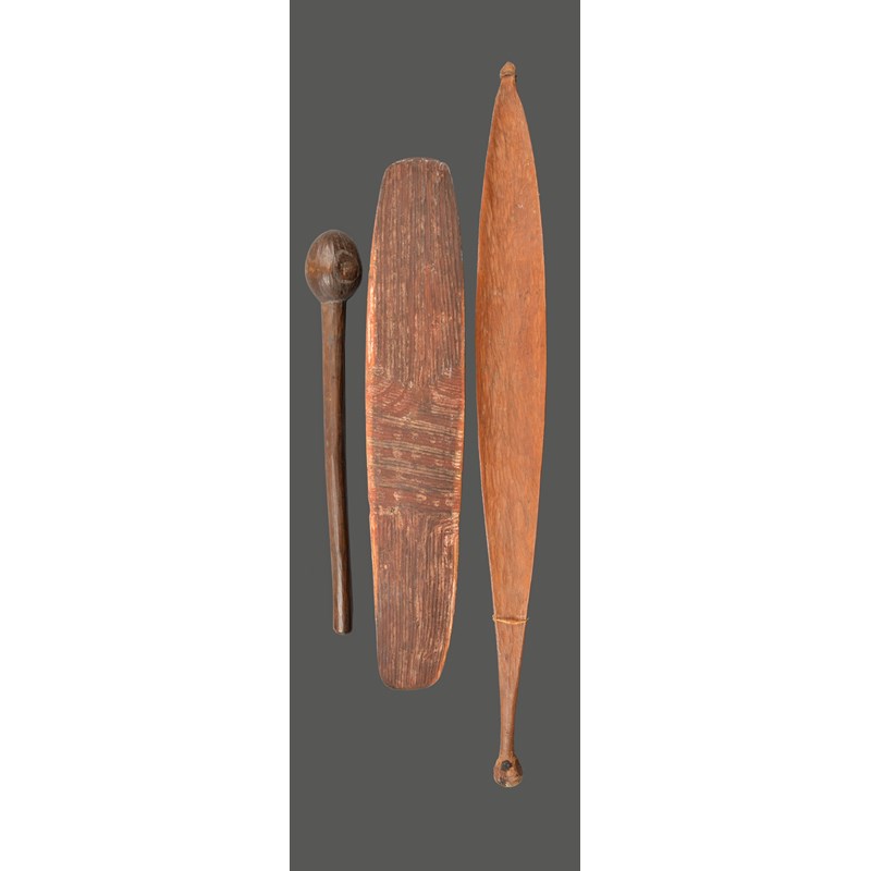 an Aboriginal spear thrower woomera, 87.5cm and a short club, 47.5cm long. (3)