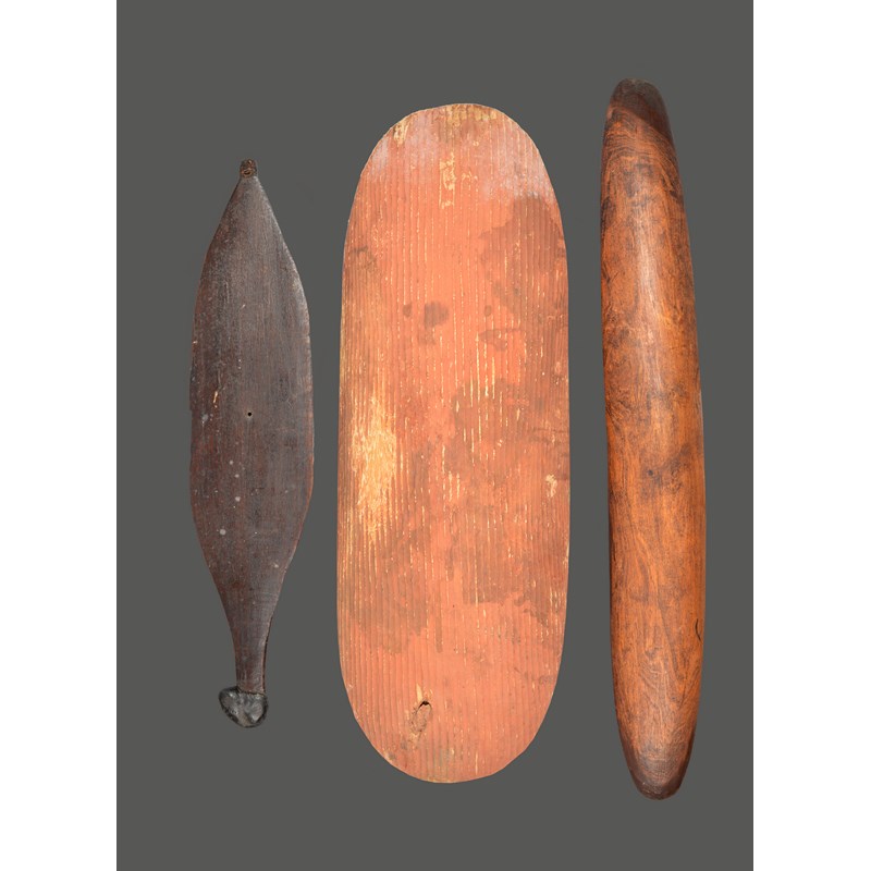 an Aboriginal narrow shield, 74cm long and an Aboriginal spear thrower woomera, 60cm long. (3)