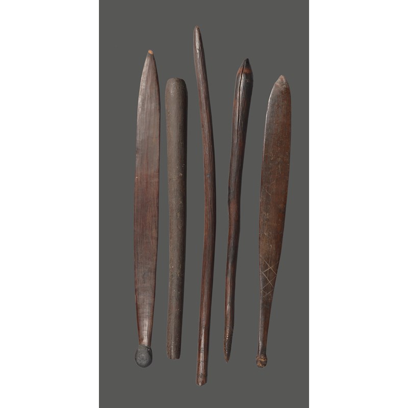 and two Aboriginal spear throwers woomera. (5)