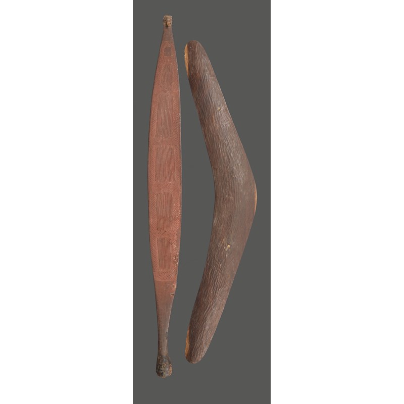 and an Aboriginal boomerang, finely textured, 77cm long. (2)