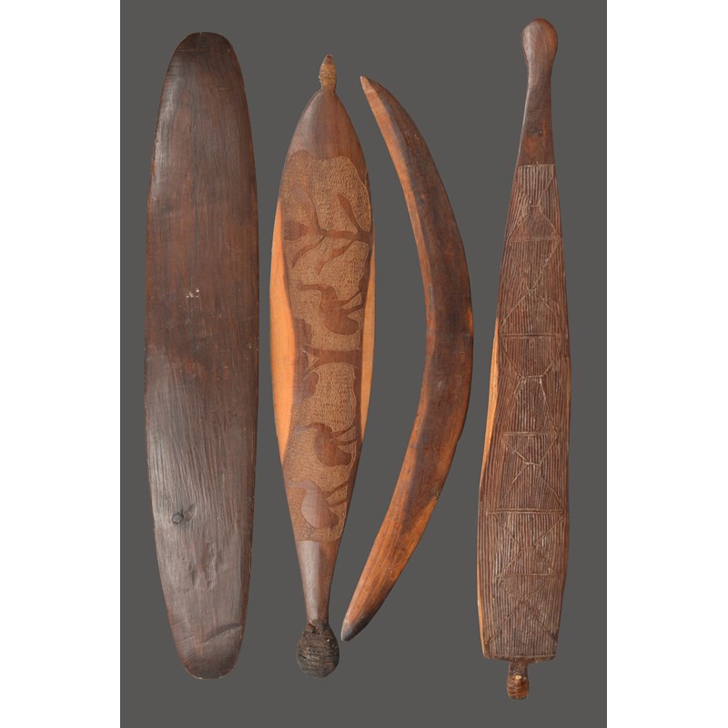 two spear throwers woomera, one with linear decoration and the other with Emu's, 79.5cm and 71.5cm long and a boomerang, 65.5cm long. (4)
