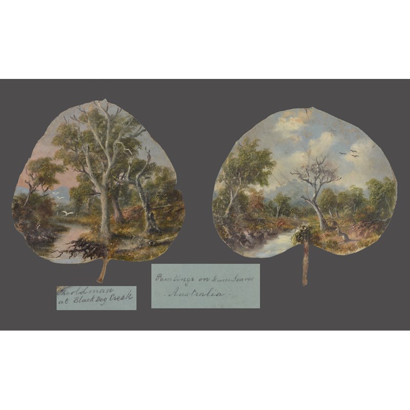 12.5cm and 13cm wide, mounted and inscribed E.N.Eustace, Artist, 1899, The oldman at Black Dog Creek. Paintings on Gum Leaves Australia, framed.