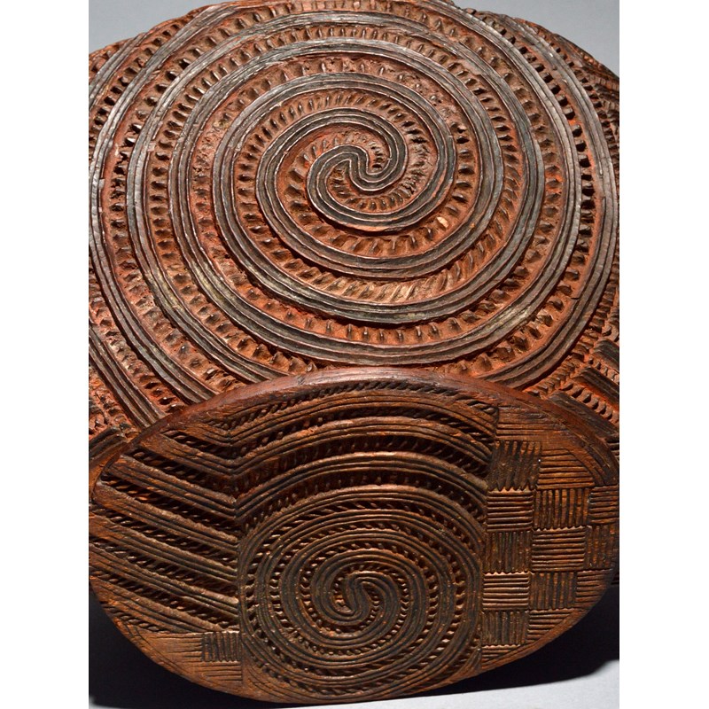 with all-over carved linear and notched decoration, with end figural handles, having a black and red pigment, the eyes and rim inlaid with haliotis shell,