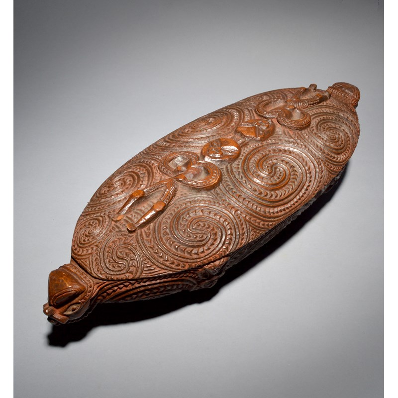 A Maori feather box waka huia New Zealand with all-over carving of linear scrolls and notches
