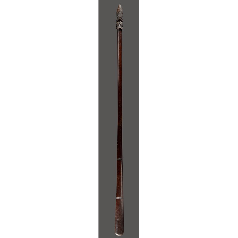 A Maori taiaha staff New Zealand with a carved Janus head and tongue finial with haliotis eyes...