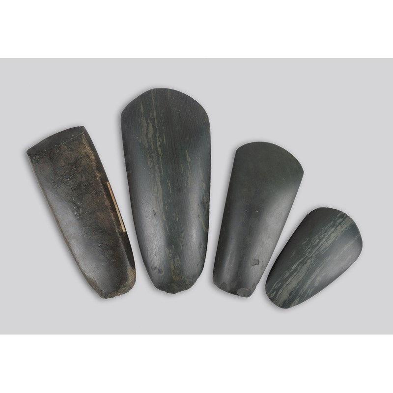 including; North America, inscribed Sacramento Indians and old printed label A Celt, of hard stone, a fine example, 19.7cm long,; three Papua New Guinea, 13cm, 17cm and 22.4cm long. (4)