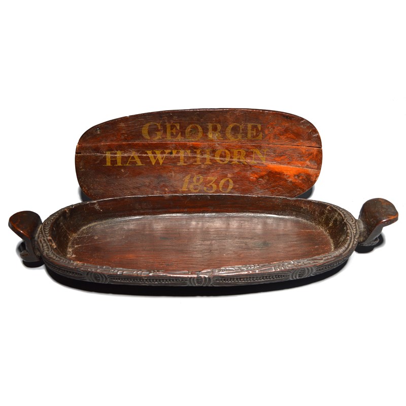 with all-over carved linear scroll and notch decoration and with tiki head handles, the underside of the cover inscribed GEORGE HAWTHORN 1830, early 19th century,