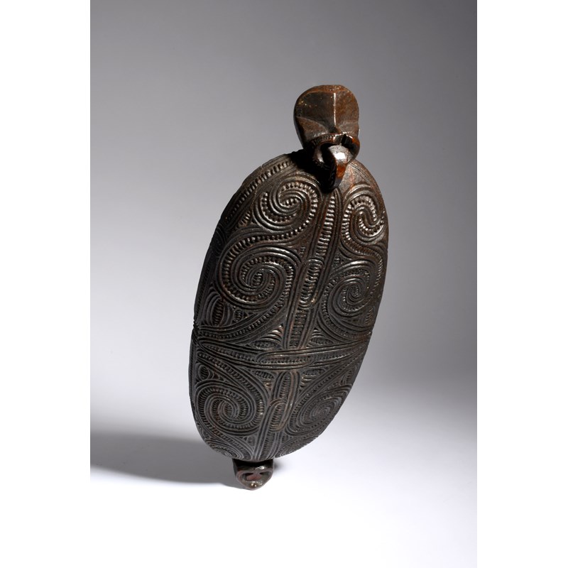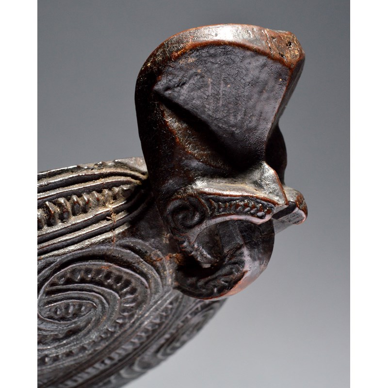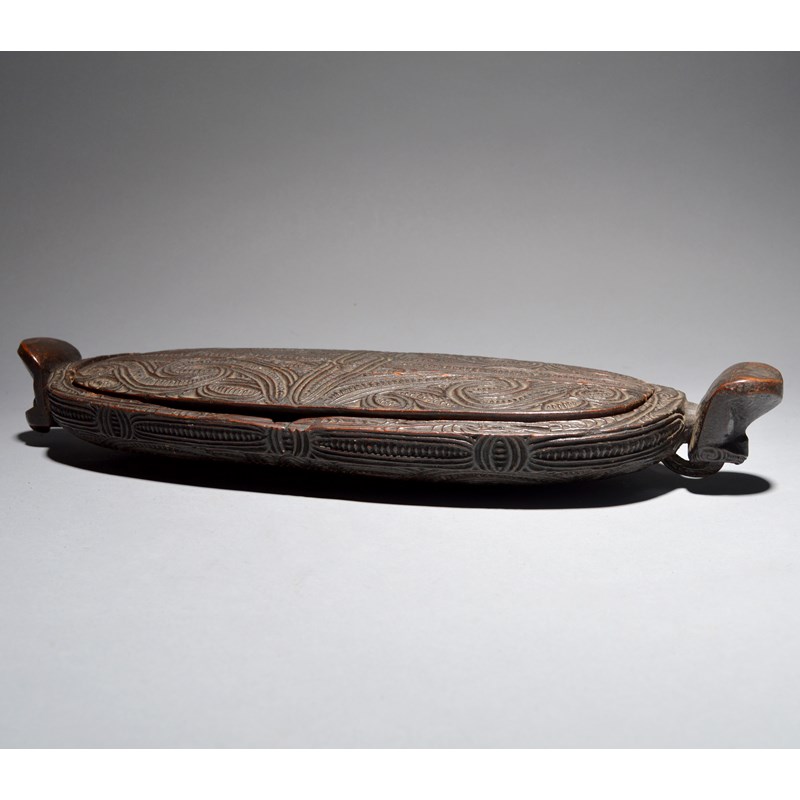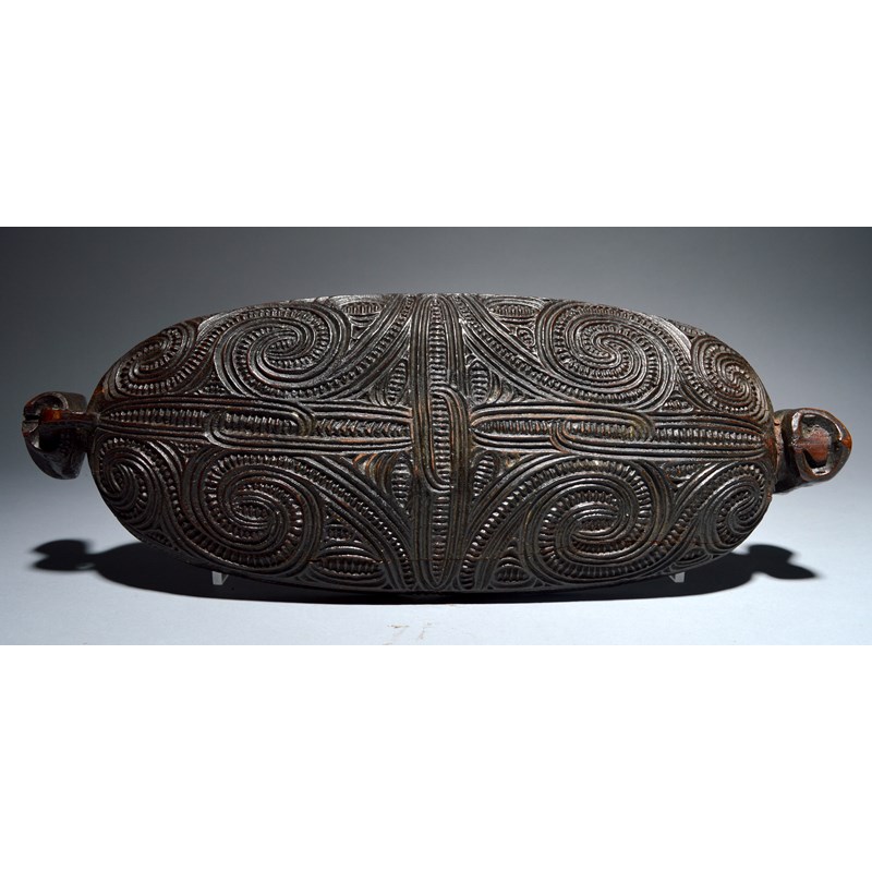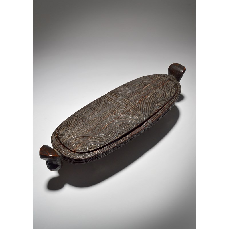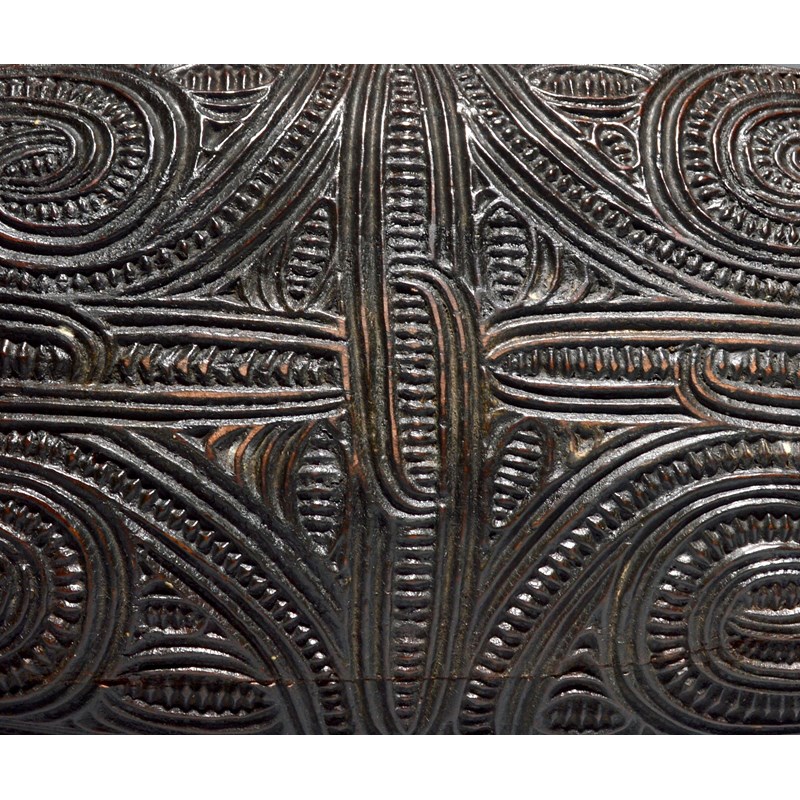 A Maori feather box waka huia New Zealand with all-over carved linear scroll and notch decoration...