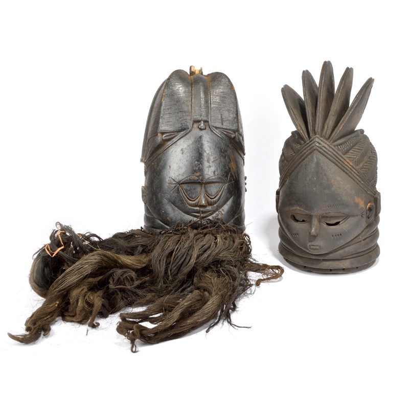 and a Mende helmet mask with a five finned coiffure, 39.5cm high. (2)