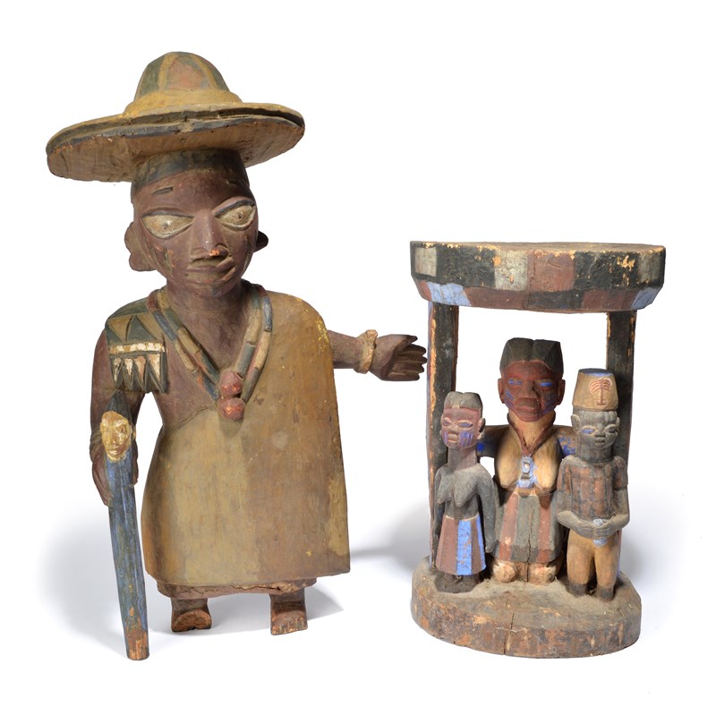 and a Yoruba caryatid stool, carved a kneeling female figure with four attendants, with painted decoration, 45cm high. (2)