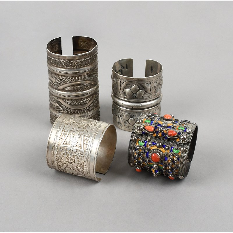 silver coloured metal, including Siwa with bird and foliate embossed decoration, hallmarks, 8cm long, two Libyan 11.2cm and 6cm long and Morocco, enamel with coral and hinged, 6.6cm long. (4)