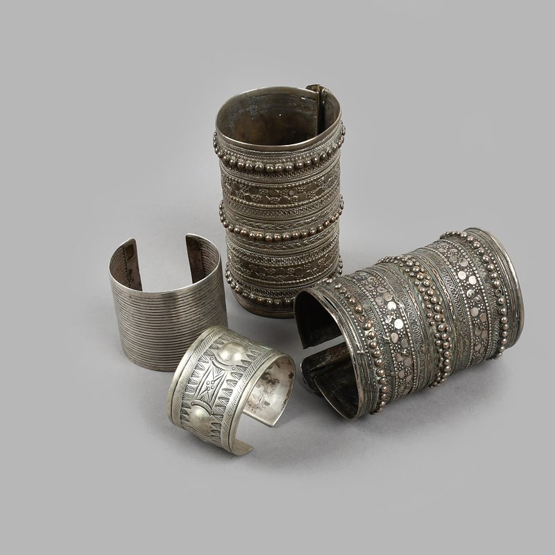 a reeded silver coloured metal bracelet, 6cm long and a Sinai bracelet with three bosses and incised linear decoration, 4cm long. (4)