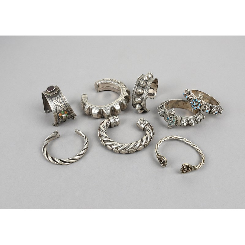 an Omani hollow spiked rattle bracelet, a Bedouin bracelet with eleven mounds, two Yemen bracelets with turquoise beads and three Nubian twist design bracelets, the larger with coin ends. (8)