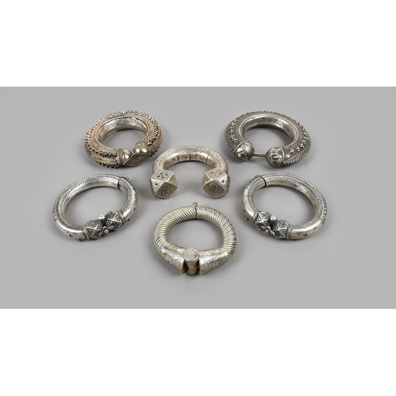 a pair of Algeria silver coloured metal bracelets, hinged and with screw pin, marked with crescent moon and star, a Nubian hollow bracelet and a hinged bracelet with a screw pin. (6)