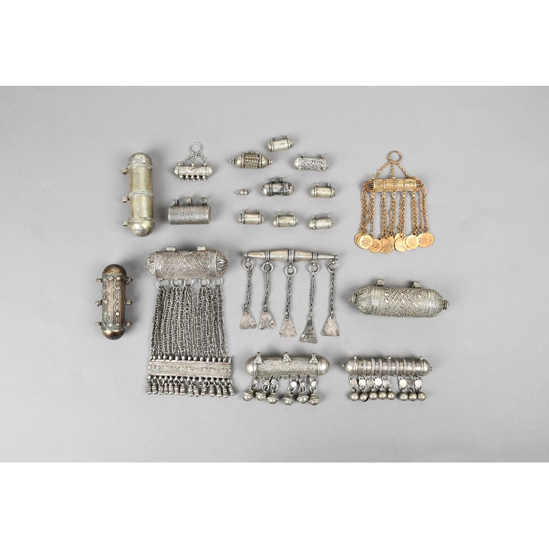 silver coloured metal, with makers mark to the top and hung with chain and a panel with pendants,