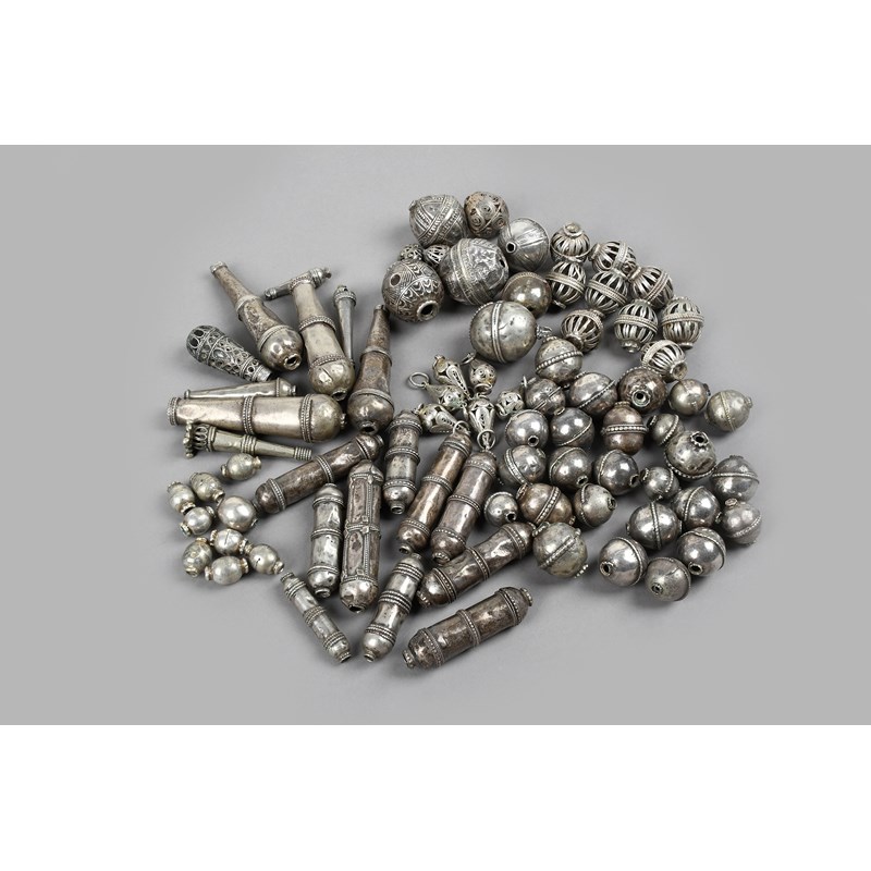 silver coloured metal, spherical, pear shape and tubular with various decoration. (a lot)