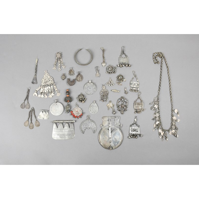 silver coloured metal, including two Egyptian temple plaques, two Red Sea area pendants, two discs, two the engraved script either side and a bracelet, necklace and a Nubian fibula. (34)