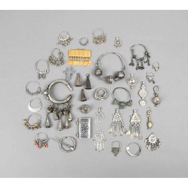 fifteen pendants, including two hamsa hands, three fibulae, two bracelets, a ring, a neillo box pendant with script and a crucifix reliquary pendant. (36)