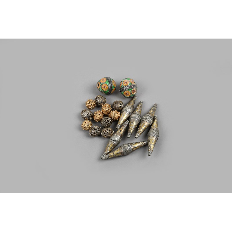 six parcel-gilt bicone beads and eleven gilt filigree beads. (19)