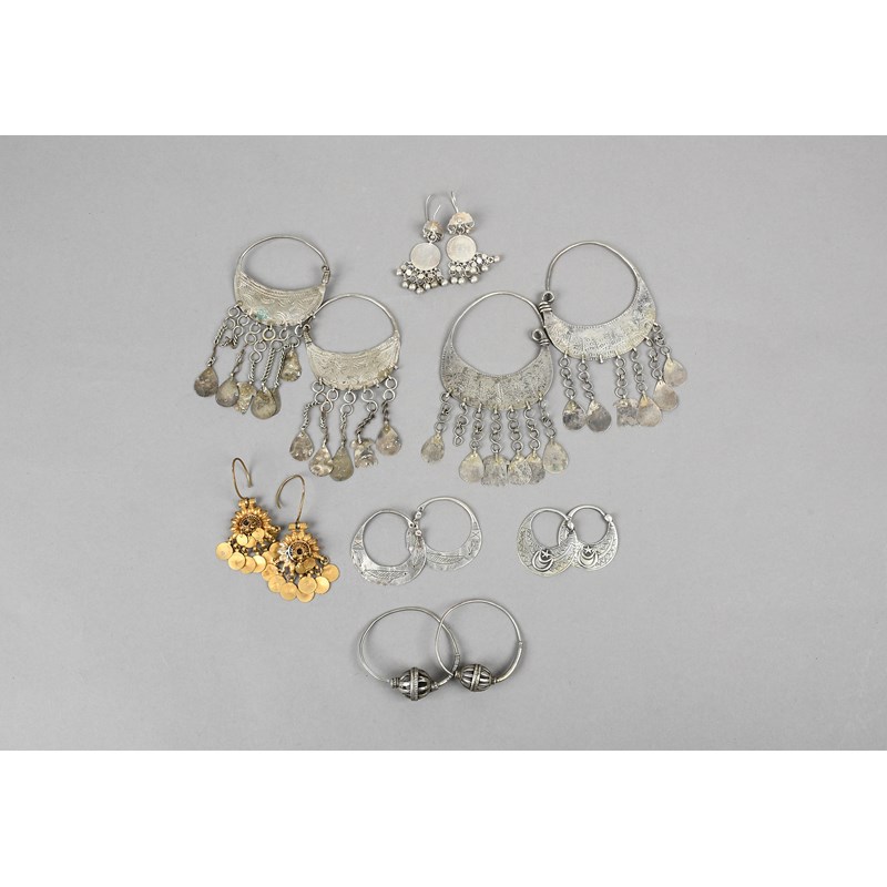 silver coloured metal, four of crescent form with engraved decoration including fish and plants, a pair with open spheres, a pair with coins and a gilt metal pair. (14)