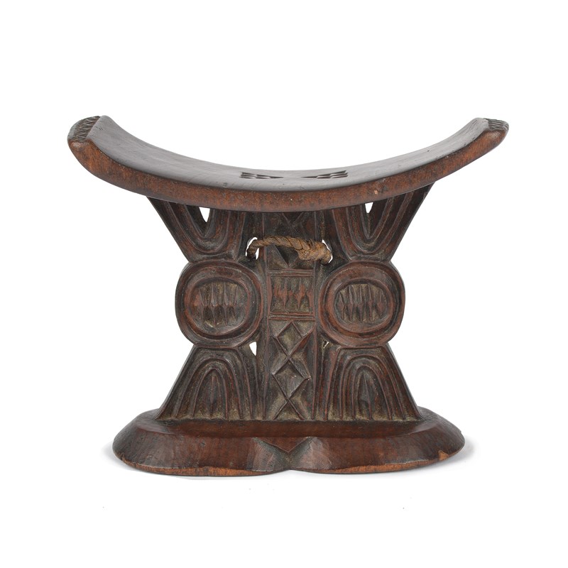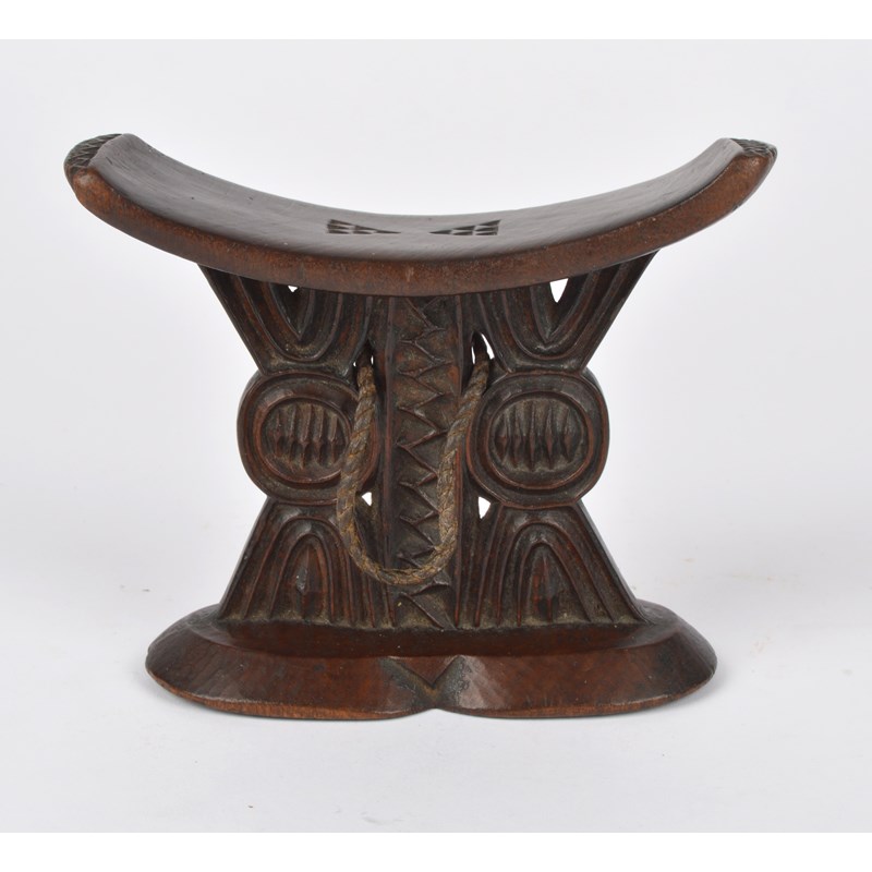 A Shona headrest Zimbabwe the top with carved triangles and zig-zags on a pierced and carved...