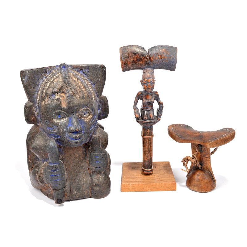 a Yoruba Shango mortar, with a carved female bust and remains of Reckitt's Blue, 33cm high and a Turkana headrest, with inlaid aluminium pins and a fibre handle, 16.5cm high. (3)