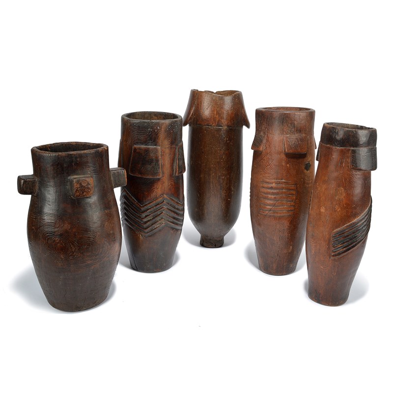 Five Zulu milk pails South Africa with lug lifts and three with relief ribbed carving and pokerwork