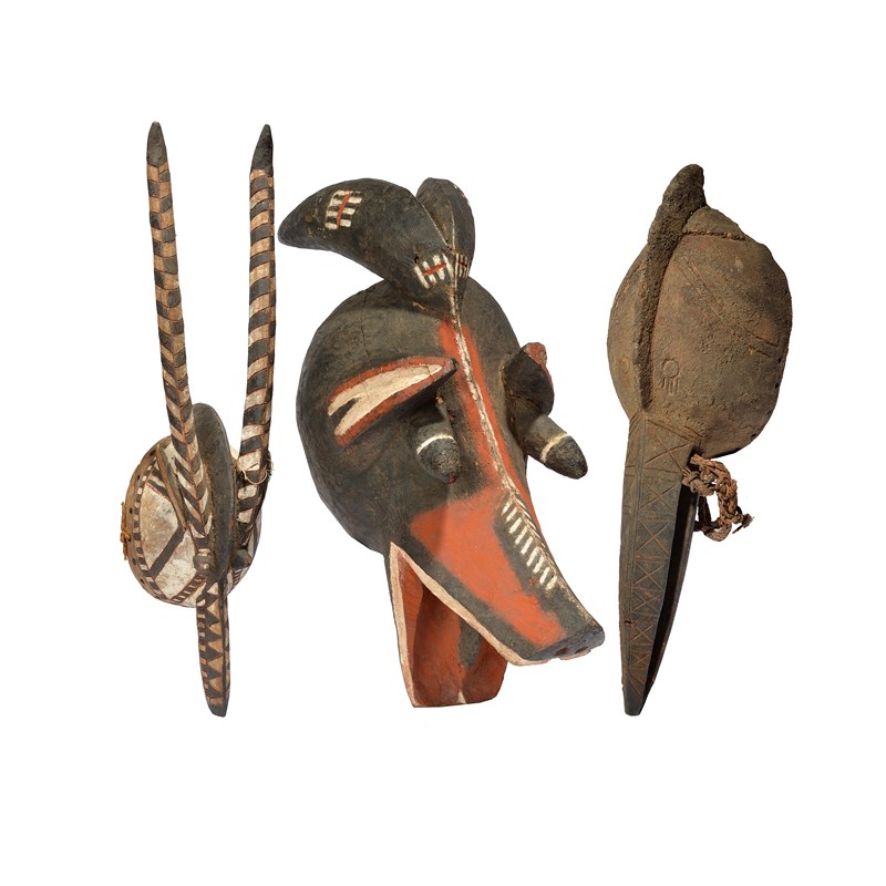 including an antelope with black and white pigment, 63.5cm high and a bird head with an encrusted patina, 58cm high and a Mambila mask, one eye with an inset seed, 50cm high. (3)