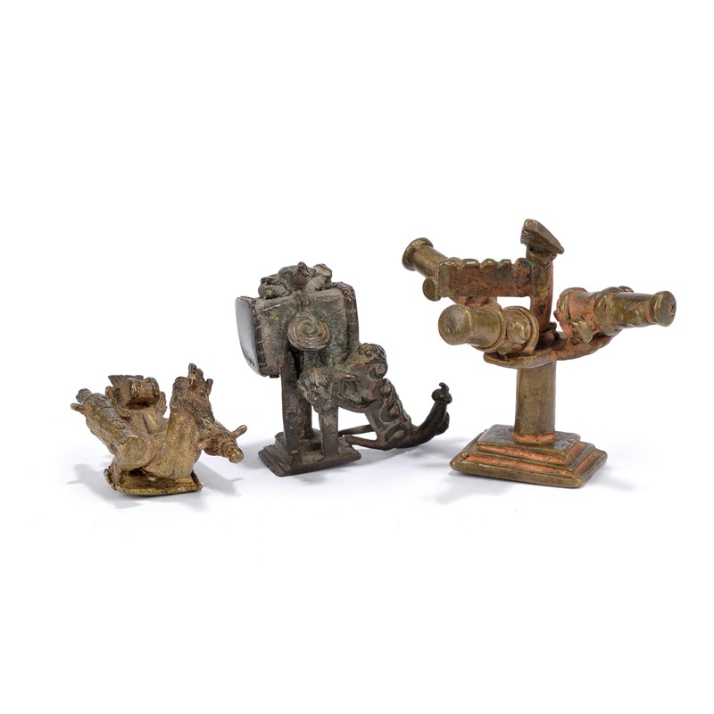 and two Ashanti brass gold weights; three cannon on a stand, 5cm high and a bird with two cannon, 4.3cm long. (3)