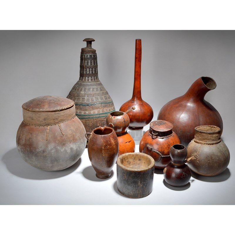 including two double gourds with incised decoration and fibre repairs, three with fibre necks and with covers, a Kenya wood milk vessel, a wood mortar and an Ethiopian basket vessel with silver coloured wire, with a cover,