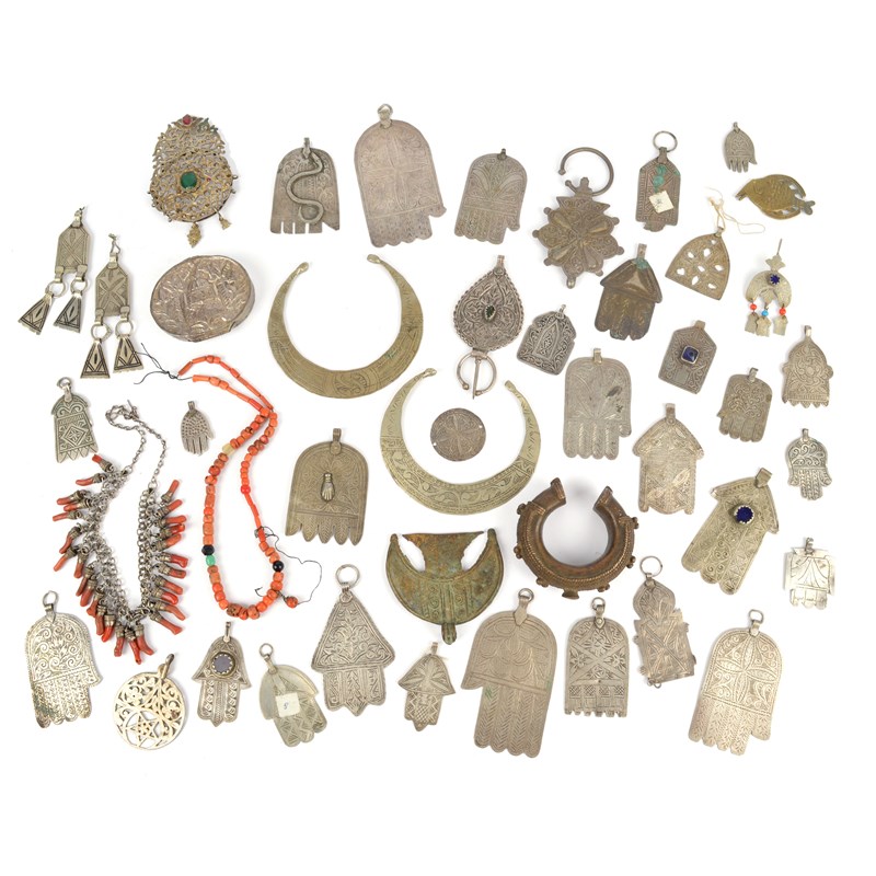 λA collection of North African hamsa pendants silver coloured metal with engraved