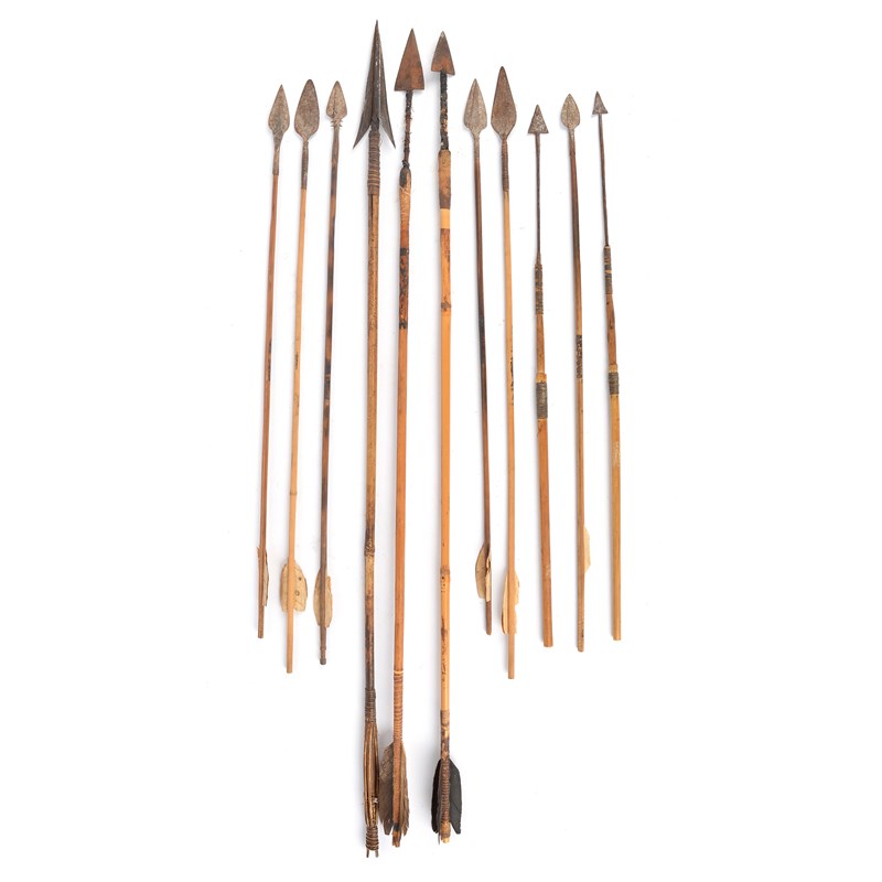 and a Cameroon arrow with a tailed tip and remains of feather flights, 64.6cm and four triangle tip arrows, two with feather flights. (11)